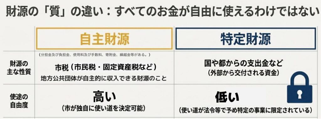 東大和市の財政の特徴 としては、市の主な収入である市税(市民税・法人市民税・固定資産税・市たばこ税等)の割合が低く、財政運営上、国や東京都からの支出金等の特定財源(国や自治体において使い道が法令等で予め特定の事業に限定されている収入のこと)が必要不可欠です。 市独自の事業を行うための財源確保において厳しい財政運営を行っています